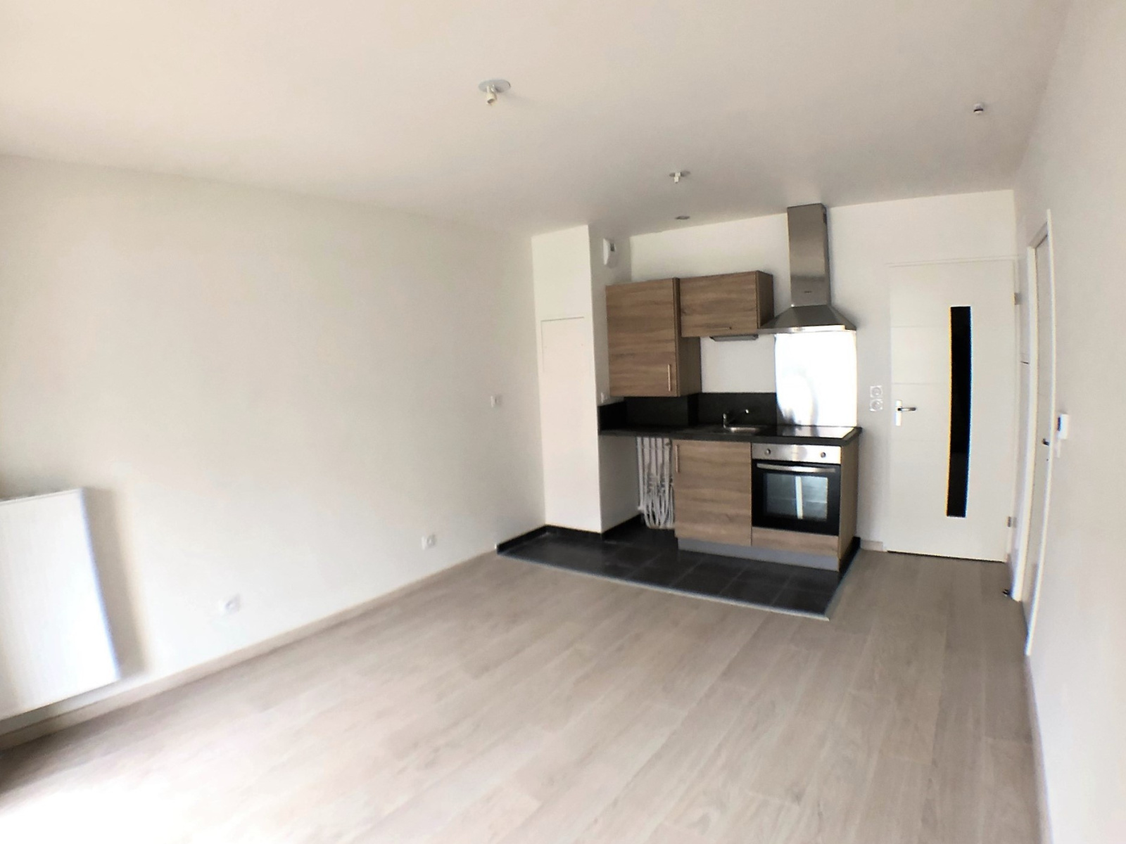 Entrée, salon avec cuisine équipée ouverte, une chambre avec placard.