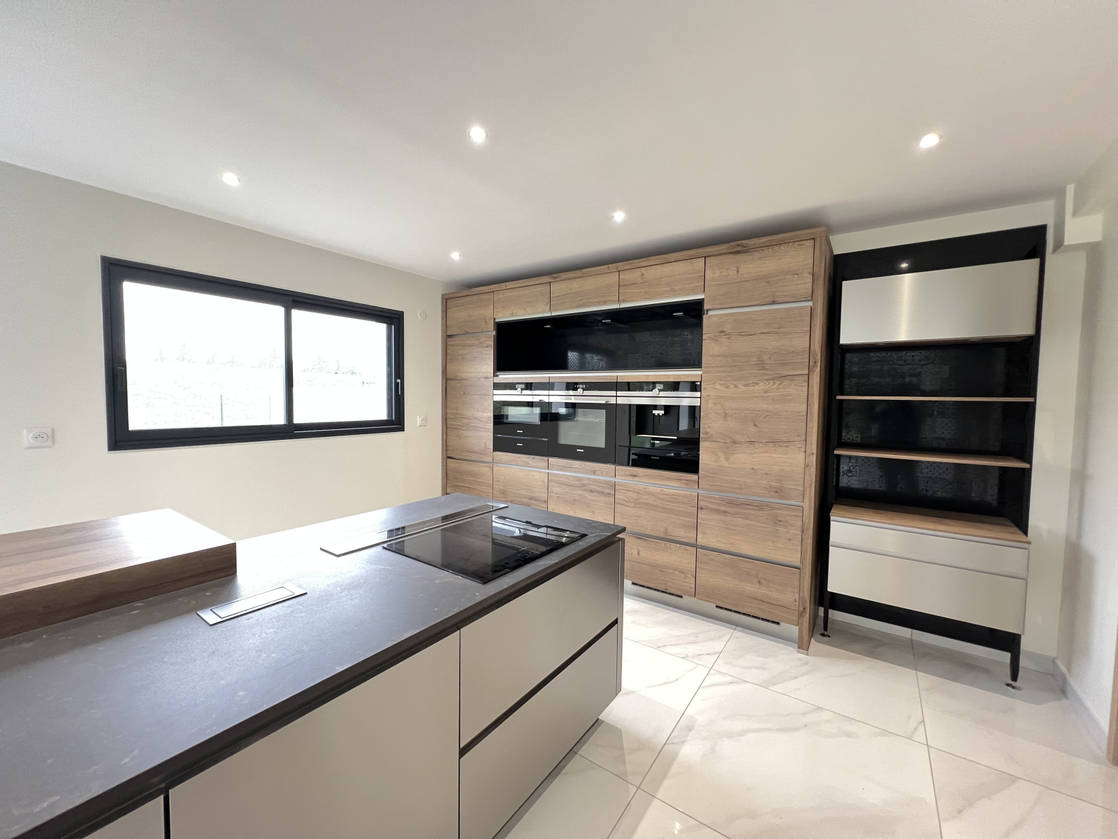 Salon lumineux avec cuisine équipée de qualité.