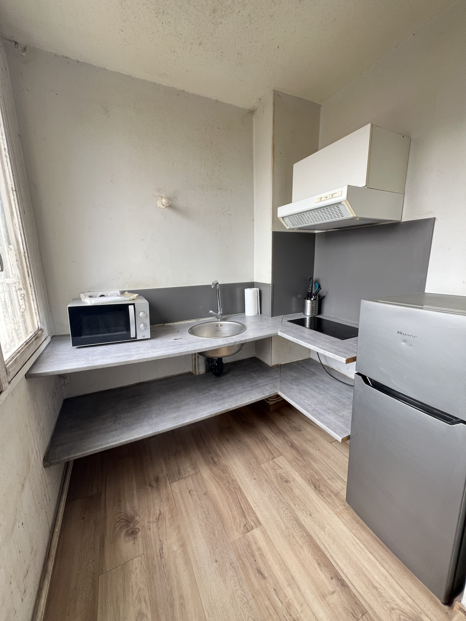 un salon de 18m², un coin cuisine, une salle d'eau avec wc.